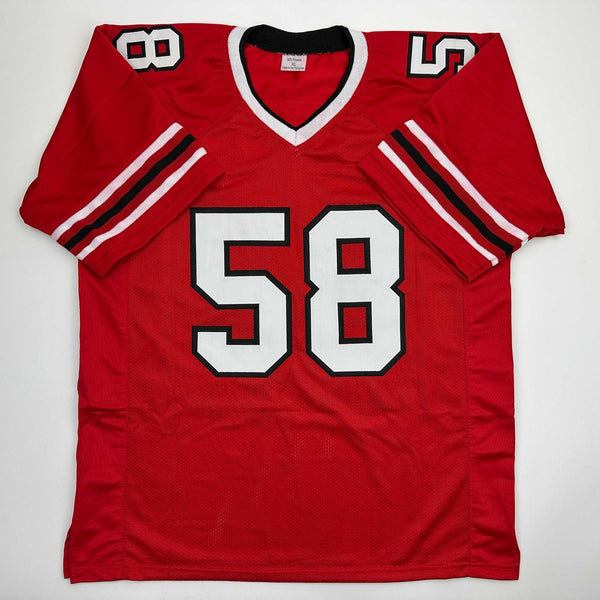 Autographed/Signed Jessie Tuggle Atlanta Red Football Jersey JSA COA Jersey has no brand names or logos. This is a custom jersey and was not manufactured by or in any manner associated with any professional sports league or manufacturer. This custom jersey carries no professional sports league designation. The item is intended to be an autographed collectible. The custom jersey displays the name and number of the player. This item in no way is affiliated with or connected to any professional sports organization. Size is XL.