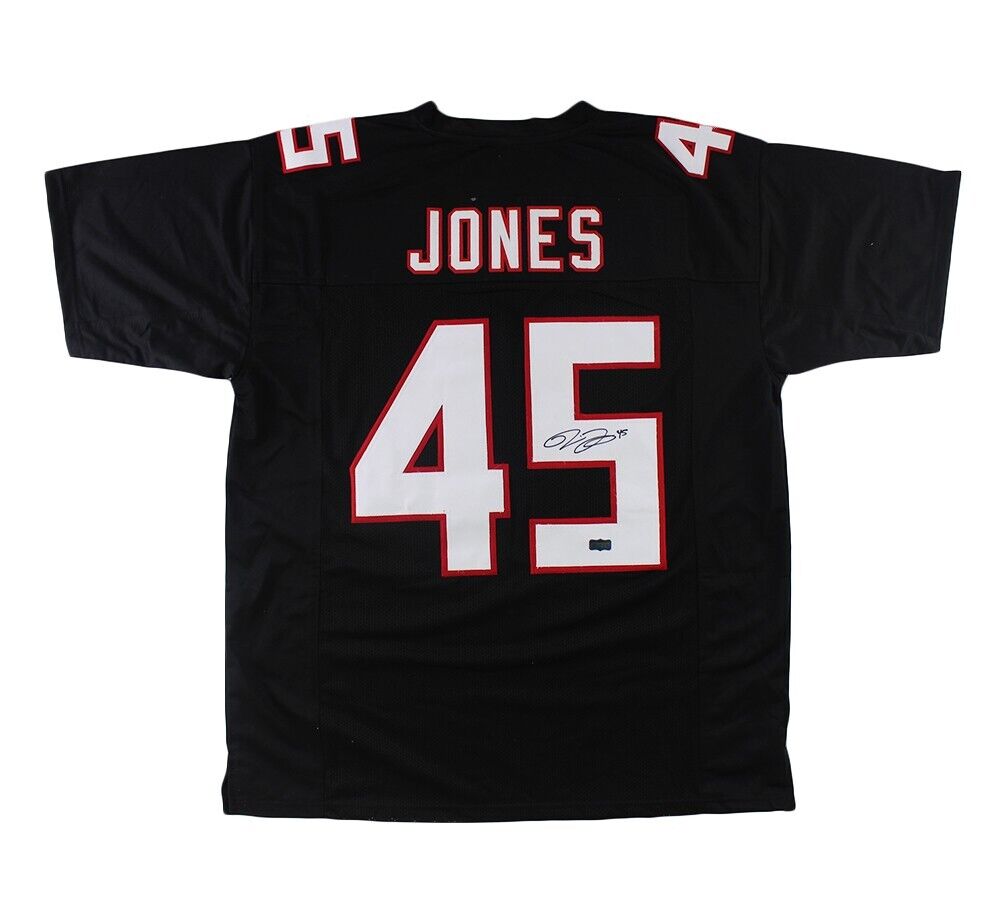 An Atlanta Black Custom Jersey hand signed by Deion Jones. The item and signature are in excellent condition. Deion is a 2017 Pro Bowler and was a 2nd Round pick in the 2016 NFL Draft. AUTHENTICATION: The item is accompanied by a Certificate of Authenticity - Serial Numbered & Databased Hologram - Picture of Deion from the signing