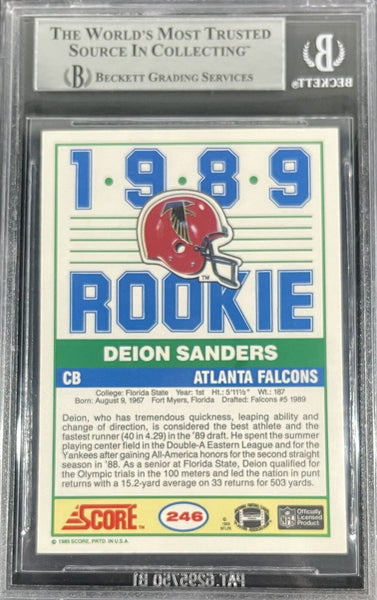 Deion Sanders Signed 1989 Score #246 (AS IS) Atlanta Falcons Card Beckett 40834 The number in the listing title is just an inventory sku for our records and is not the authentication number. This is the exact item that you will receive so please see pictures for condition. This is a 1989 Score #246 trading card that was personally autographed by Deion Sanders. This item is sold as is. This has been professionally slabbed by Beckett Authentication Services (BAS) and includes a certificate of authenticity from Denver Autographs.