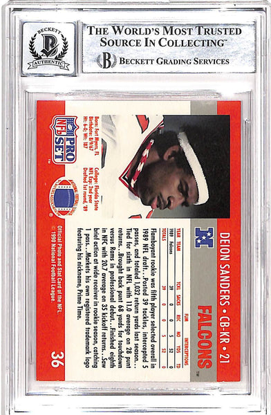 Deion Sanders Signed 1990 Pro Set #36 Card Grade 10 Auto Beckett 42656 The number in the listing title is just an inventory sku for our records and is not the authentication number. The item pictured is a stock photo unless otherwise noted. This is a slabbed 1990 Pro Set #36 Trading Card with a Grade 10 Autograph that was personally autographed by Deion Sanders. Includes a certificate of authenticity from Beckett Authentication Services (BAS) and Denver Autographs.