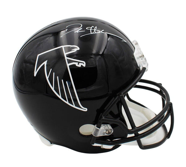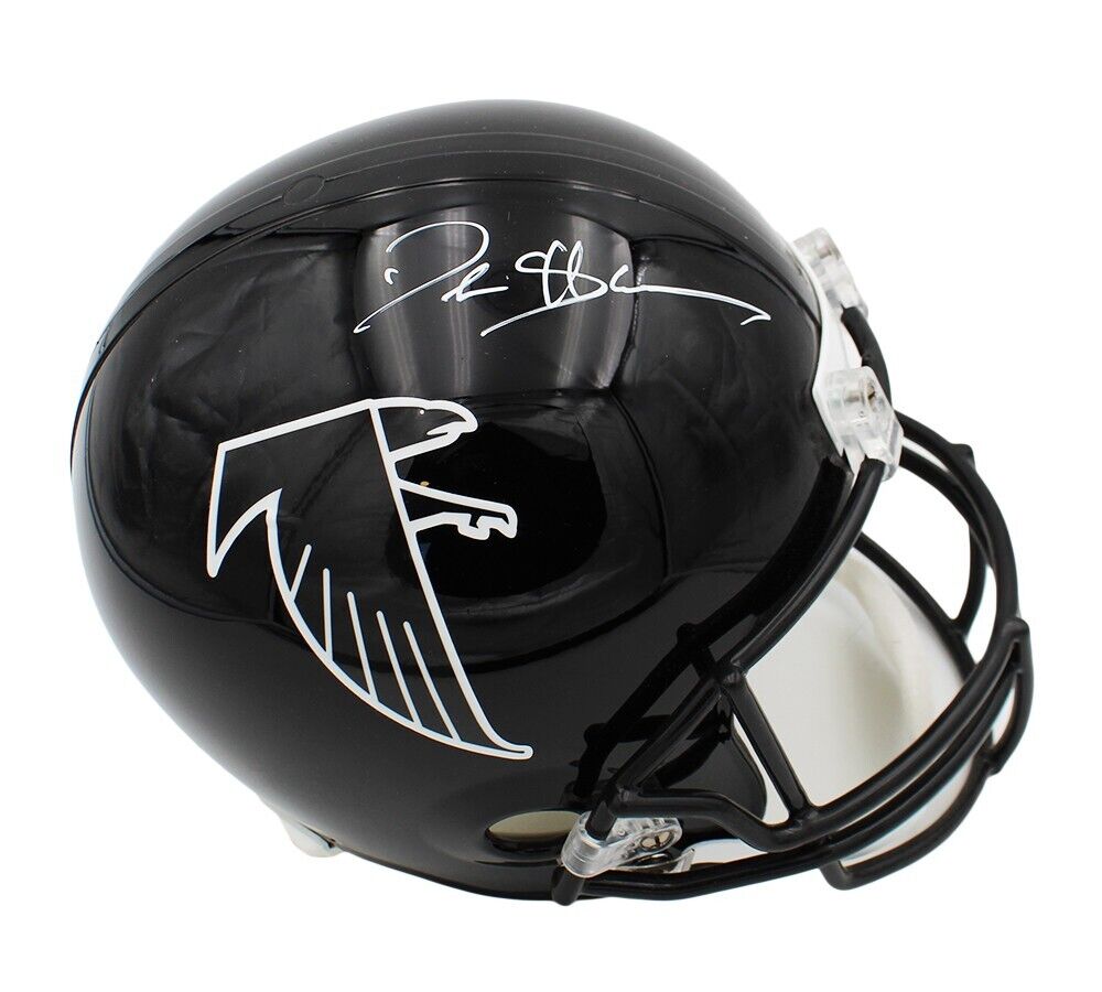 An Atlanta Falcons Throwback Replica Black NFL Helmet hand signed by Deion Sanders. The item and signature are in excellent condition. Deion is a 2x Super Bowl Champion, 8x Pro Bowler, in the Atlanta Falcons Ring of Honor and dominated two sports during his career. AUTHENTICATION: The item is accompanied by a Certificate of Authenticity and a Authentic Serial Numbered and Databased Hologram