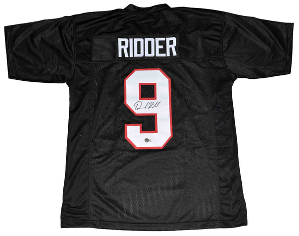 Desmond Ridder, quarterback for the Atlanta Falcons, has hand signed this black custom jersey at a private signing. Jersey is size XL and all letters/numbers are sewn-on. This item is authenticated by Beckett Authentication Services and was signed in the presence of one of their representatives. Their tamper-evident hologram featuring a QR code and serial number is on the item. The authenticity can be verified online by entering the serial number or scanning the QR code. Item pictured may not be the exact item you will receive. It will be similar quality, and we guarantee your satisfaction.