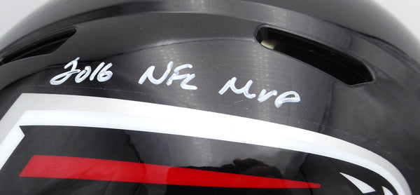 This is a Black Full Size Authentic Helmet that has been hand signed by Matt Ryan. This item was inscribed "2016 NFL MVP." There is a smudge in the signature as shown. This item has been certified authentic by Beckett Authentication (BAS) and comes with their tamper-proof QR Code sticker that can be verified on the Beckett-authentication.com.