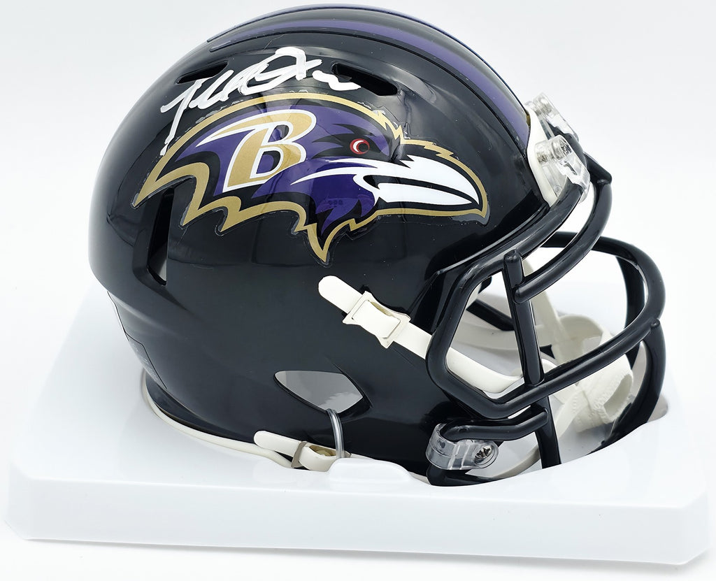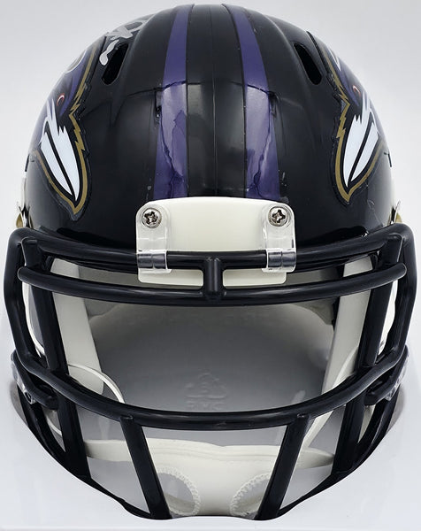 This is an Atlanta Falcons Black Speed Mini Helmet that has been hand signed by Terrell Suggs. There is an imperfection in the signature as shown. This item has been witnessed and certified authentic by Beckett Authentication (BAS) and comes with their tamper-proof witness hologram.