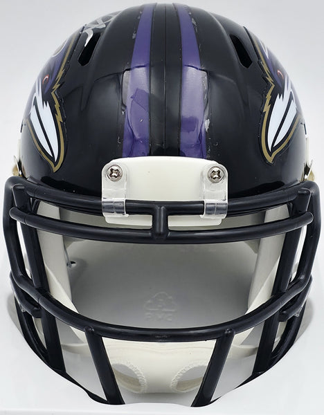 This is an Atlanta Falcons Black Speed Mini Helmet that has been hand signed by Terrell Suggs. There is an imperfection in the signature as shown. This item has been witnessed and certified authentic by Beckett Authentication (BAS) and comes with their tamper-proof witness hologram.