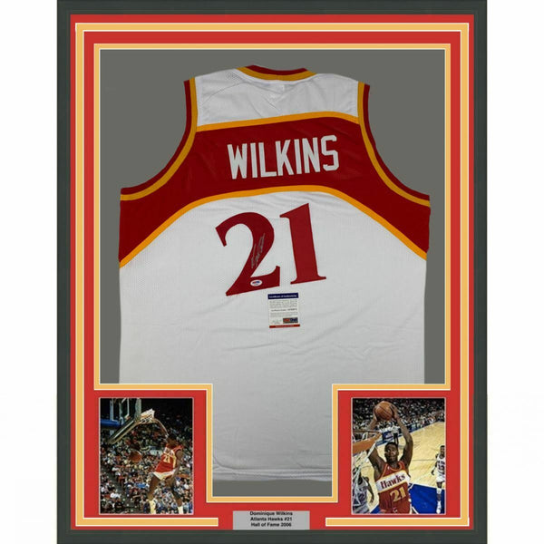 FRAMED Autographed/Signed DOMINIQUE WILKINS 33x42 Atlanta White Jersey PSA COA The item is professionally framed & matted with two 8x10 photos, measures 33"x42" and is ready to be hung in your man cave! NOTE: COA card will be mounted on the back of the frame, not inside it on top of the jersey as seen in the picture.