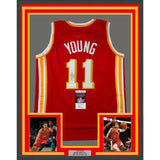 Framed Autographed/Signed Trae Young 33x42 Atlanta Red Jersey JSA COA The item is professionally framed and matted with two 5x7 photos, measures 35 inches by 39 inches and is ready to be hung in your man cave! Photo and matting requests can be made.