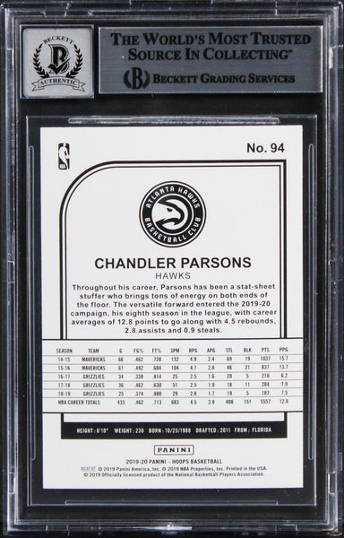 This Autographed Auto Graded Gem Mint 10! 2019 Hoops #94 Card has been Personally Signed by Chandler Parsons of the Atlanta Hawks. This item is 100% Authentic, it comes slabbed and authenticated by Beckett Authentication Services. The authenticity can be verified on Beckett Authentication Services website.