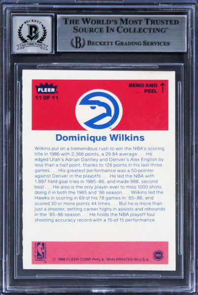This Autographed Auto Graded Gem Mint 10! 1986 Fleer Stickers #11 Rookie Card with the inscription of "HOF 06" has been Personally Signed by Dominique Wilkins of the Atlanta Hawks. This item is 100% Authentic, it comes slabbed and authenticated by Beckett Authentication Services. The authenticity can be verified on Beckett Authentication Services website.