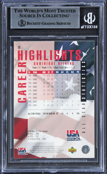 This Autographed 1994 Upper Deck USA Gold Medal #75 Card has been Personally Signed by Dominique Wilkins of the Atlanta Hawks. This item is 100% Authentic, it comes slabbed and authenticated by Beckett Authentication Services. The authenticity can be verified on Beckett Authentication Services website.
