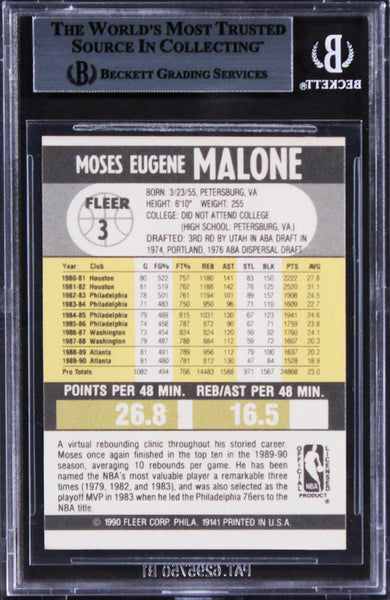 This Autographed 1990 Fleer #3 Card has been Personally Signed by Moses Malone of the Atlanta Hawks. This item is 100% Authentic, it comes slabbed and authenticated by Beckett Authentication Services. The authenticity can be verified on Beckett Authentication Services website.