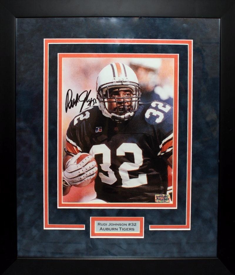 Rudi Johnson, former star running back for the Auburn Tigers, has hand signed this 8x10 photo at a private signing. It comes professionally framed in a black wood frame and double matted in Auburn colors. This item comes with a certificate of authenticity (COA) from Signature Sports Marketing, one of the leaders in the industry. You will receive a paper COA along with matching serial-numbered holograms.Item pictured may not be the exact item you will receive. It will be similar quality, and we guarantee your satisfaction.