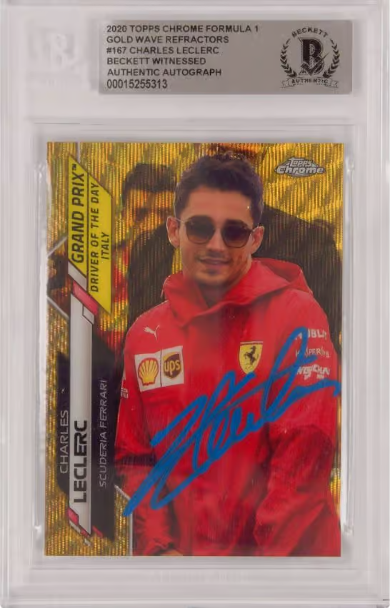 This is a Charles Leclerc Signed 2020 Topps Chrome F1 Gold Wave /50 - BGS Authentic. THE ITEM IN THE PICTURE IS A STOCK IMAGE. YOU WILL RECEIVE AN IDENTICAL ITEM OF EQUAL QUALITY. ALL JERSEYS ARE SIZE LARGE. Every item of signed memorabilia we sell is official and of the highest quality. We pride ourselves on providing sports fans with the most exclusive signed memorabilia on the market. We are an industry leading signed memorabilia company who can guarantee 100% authenticity on every signature we sell. The item you receive will be identical to the one you are seeing in the stock pictures. This includes the item, the authentication company, signature color and signature placement. We take pride in ensuring the authenticity of all our items. With unwavering commitment, we guarantee that every signature is 100% authentic. Every item of signed memorabilia comes with a scannable barcode which takes you to the certificate of authenticity on the company's website. These industry leading authentication companies include Beckett Authentication Services, James Spencer Authentication Services and Professional Sports Authentication Services.