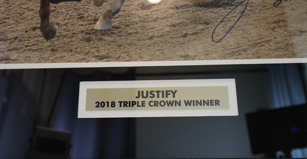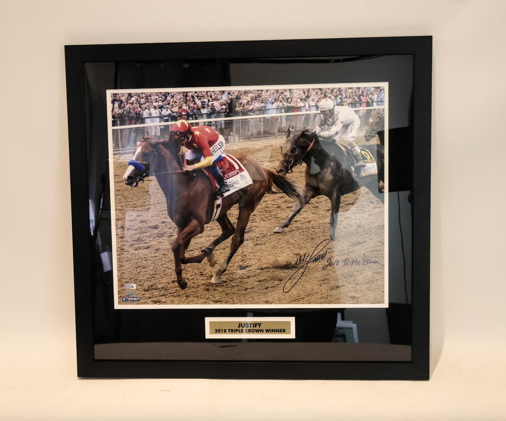 Historic 2018 Triple Crown Winner - Justify Celebrate one of horse racing's most remarkable achievements with this authentic signed 16x20 photograph of Justify, the 2018 Triple Crown winner, personally autographed by legendary jockey Mike Smith. What Makes This Historic: Triple Crown Champion - Only the 13th horse in history to win the Kentucky Derby, Preakness Stakes, and Belmont Stakes Signed by Mike Smith - Hall of Fame jockey who rode Justify to Triple Crown glory Inscribed '2018 Triple Crown' - Commemorates the historic achievement Steiner Sports Authenticated - Comes with official Certificate of Authenticity Museum-Quality Framing - Professional 16x20 presentation ready to display The Justify Legacy: Justify made history in 2018 by becoming the first horse since Apollo in 1882 to win the Kentucky Derby without racing as a two-year-old. Under Mike Smith's expert guidance, this magnificent colt captured the hearts of racing fans worldwide with his dominant Triple Crown performance. Perfect For: Horse racing enthusiasts and collectors Sports memorabilia investors Kentucky Derby and Triple Crown fans Home, office, or man cave display Investment Quality: Triple Crown winners are extremely rare, making authenticated memorabilia from these champions highly sought after by collectors. Arrives professionally framed and ready to hang. Steiner Sports authentication ensures the signature's authenticity and your investment's value.