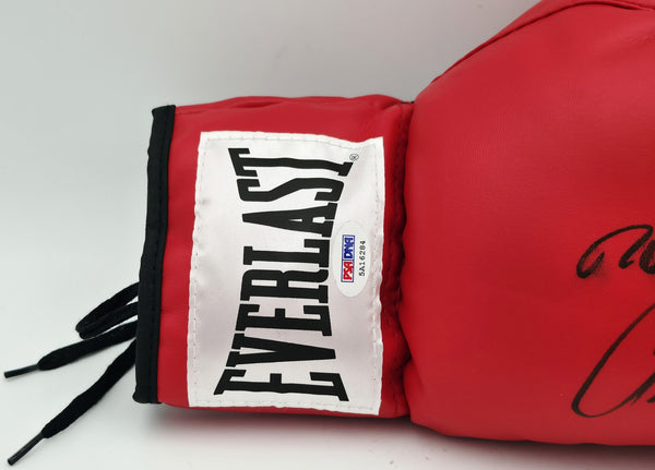 This is a Red Everlast Boxing Glove that has been hand signed by Boxing Greats. This glove is right handed. There is an imperfection in the signature as shown. This item has been certified authentic by PSA/DNA and comes with their tamper-proof hologram and matching certificate of authenticity.