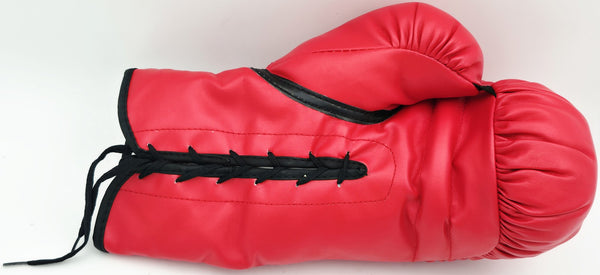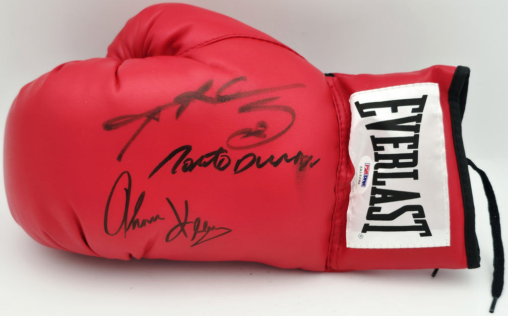 This is a Red Everlast Boxing Glove that has been hand signed by Boxing Greats. This glove is left handed. There is an imperfection in the signature as shown. This item has been certified authentic by PSA/DNA and comes with their tamper-proof hologram and matching certificate of authenticity.