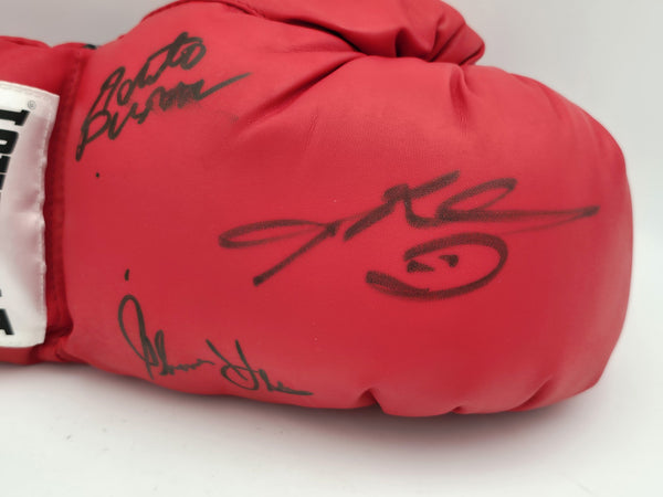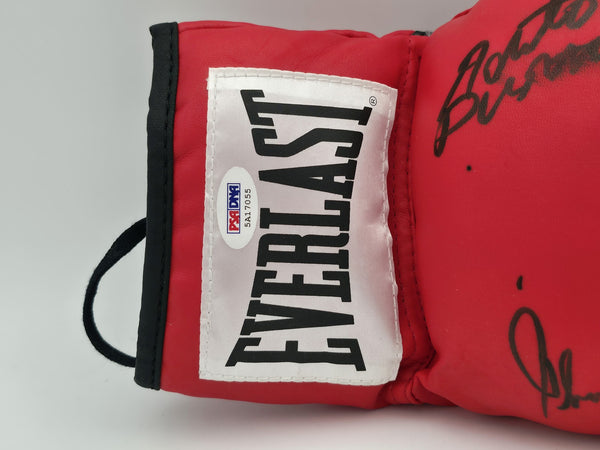 This is a Red Everlast Boxing Glove that has been hand signed by Boxing Greats. This glove is right handed. There is an imperfection in the signature as shown. This item has been certified authentic by PSA/DNA and comes with their tamper-proof hologram and matching certificate of authenticity.