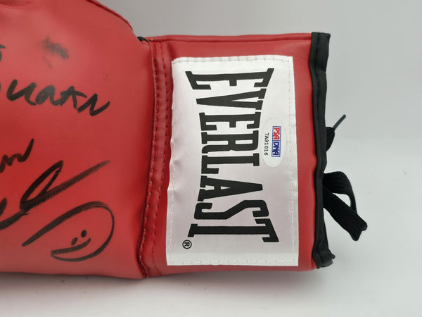 This is a Red Everlast Boxing Glove that has been hand signed by Boxing Greats. This glove is left handed. There is an imperfection in the signature as shown. This item has been certified authentic by PSA/DNA and comes with their tamper-proof hologram and matching certificate of authenticity.