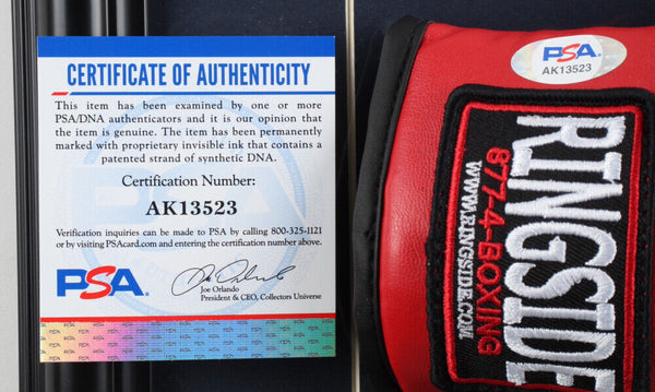 Custom frame measures approximately 17" x 22" in size and features a Ringside boxing glove that has been hand-signed by Mike Tyson (HOF). Includes full 1986 Boxing magazine as shown.The lot / autograph(s) includes an official PSA/DNA hologram and matching COA for authenticity purposes.Authentication: PSA COA