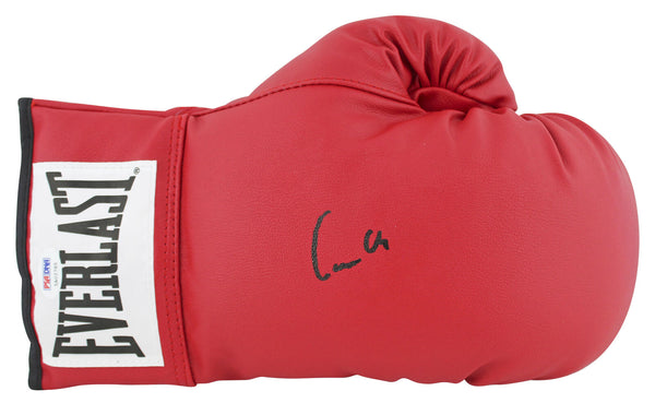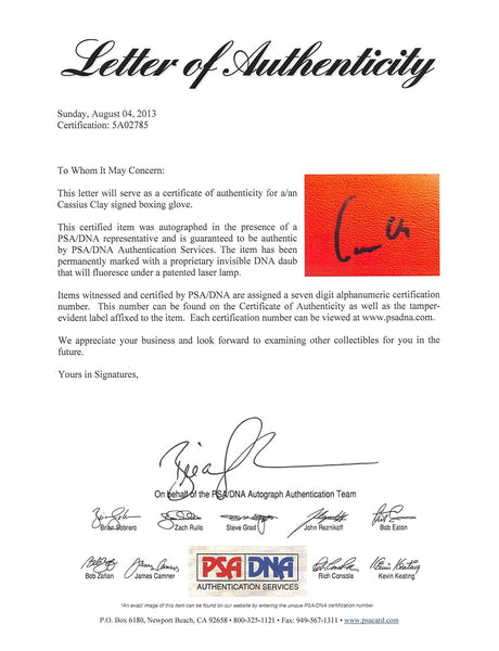 This Autographed Red Everlast Boxing Glove has been Personally Signed by Muhammad Ali "Cassius Clay". This item is 100% Authentic and comes with a PSA/DNA Certification Card and a matching numbered Hologram. This is a PSA in the Presence Authenticated item which means a PSA representative was present when this item was being signed. The authenticity can be verified on Professional Sports Authenticator website.