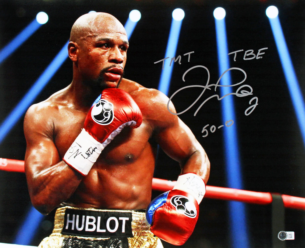 This Autographed w/ Red Gloves Horizontal 16x20 Photo with the inscription of "50-0 TBE TMT" has been Personally Signed by Floyd Mayweather. This item is 100% Authentic to include a hologram by Beckett Authentication Services. This item will come with an affixed Beckett Authentication Services (BAS) authentication sticker, which includes a scannable QR code to verify authenticity. Please note that Beckett no longer provides serial-numbered COA cards, and the attached BAS sticker will serve as the complete authentication for this item. We have multiples of this same item. While the photographs are representative of this item, the size, placement and strength of the signature may vary. Each item is hand signed, therefore, each autograph is unique.