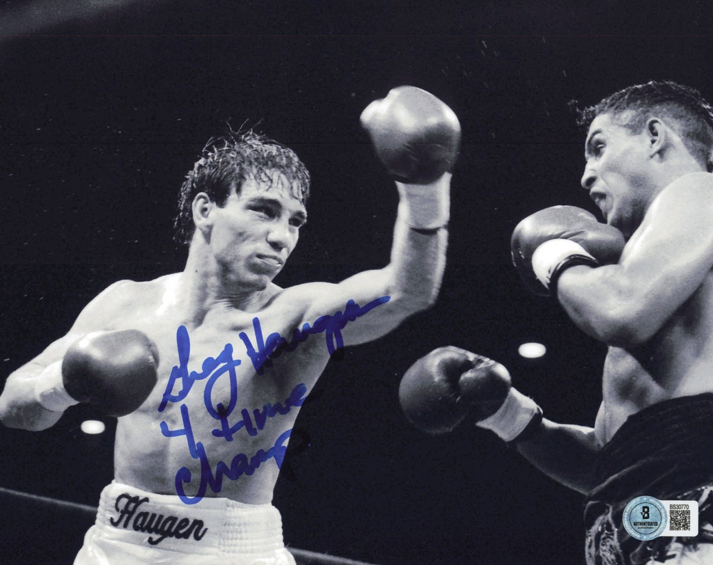 This is an 8x10 Photo that has been hand signed by Greg Haugen. This item was inscribed "4 Time Champ." This item has been certified authentic by Beckett Authentication (BAS) and comes with their tamper-proof QR Code hologram.