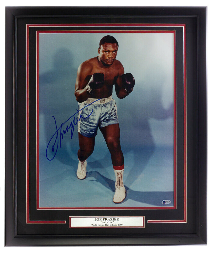 Featured is a Joe Frazier signed and framed 16x20 photo. This photo was hand signed by Joe Frazier and authenticated by Beckett authentication services. Included with the photo is a Beckett hologram and certificate of authentication. Brand new professional framing featuring double matting and an engraved nameplate. The frame measures approximately 27x22 in total size. The frame is ready for display. Product Details BrandSports IntegrityManufacturerSports IntegrityProduct TypeBoxing/Autographed PhotosMpn33150