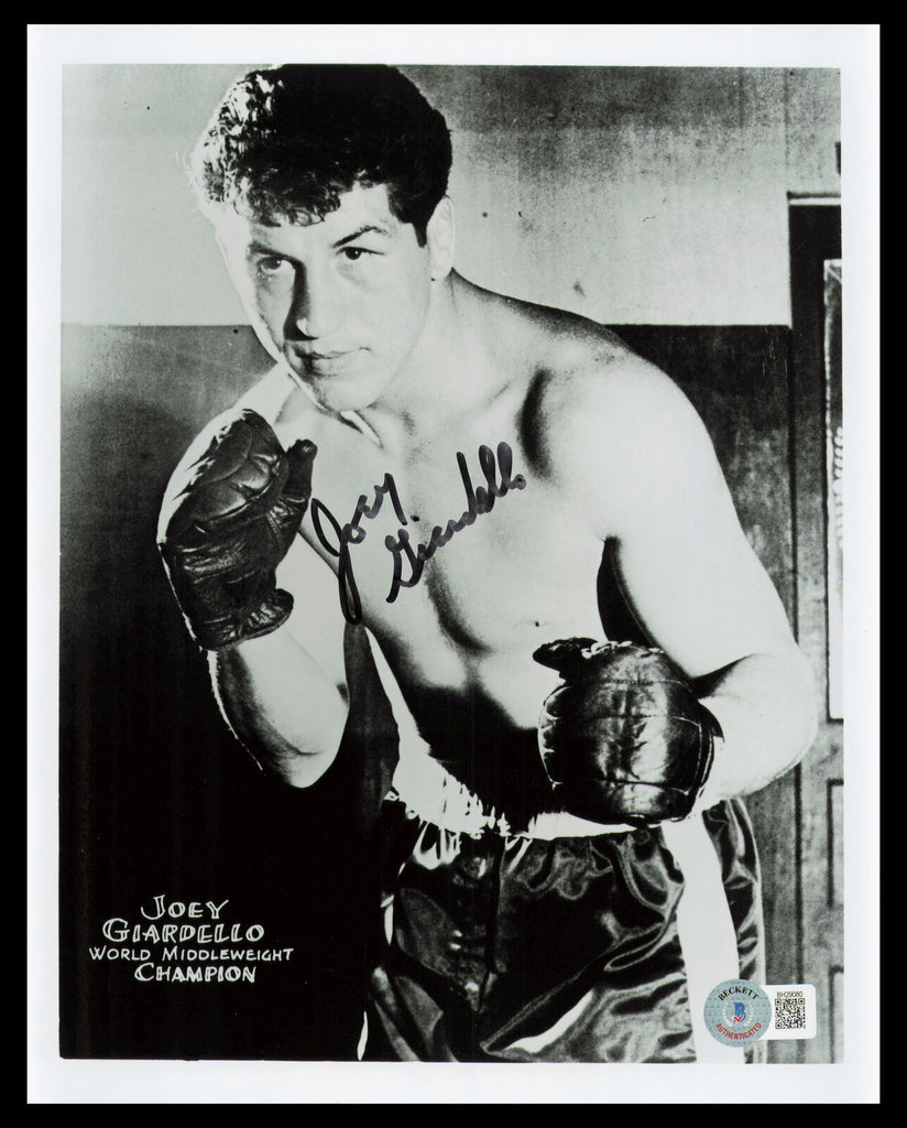 This is an 8x10 Photo that has been hand signed by Joey Giardello. This item has been certified authentic by Beckett Authentication (BAS) and comes with their tamper-proof QR Code hologram that can be verified on the Beckett-authentication.com.
