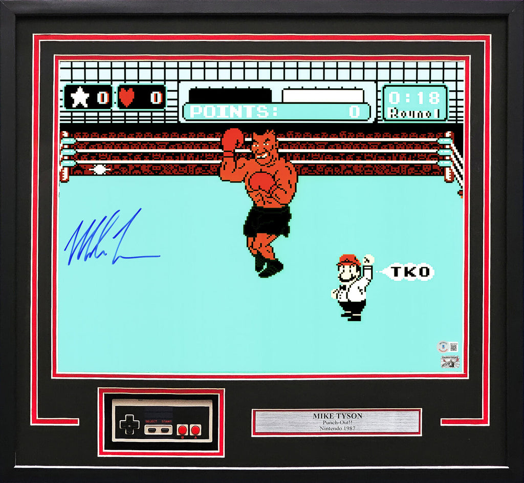This is a Framed 16x20 Nintendo Punch-Out!! Photo With NES Controller, approximately 24x28 with the frame, that has been hand signed by Mike Tyson. This item has been certified authentic by Beckett Authentication (BAS) and comes with their tamper-proof QR Code sticker that can be verified on beckett-authentication.com.