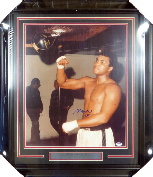 This is a framed 16x20 photo, approximately 24x28 with the frame, that has been hand signed by Muhammad Ali. It has been authenticated by PSA/DNA and comes with their sticker and matching full page certificate of authenticity.A A