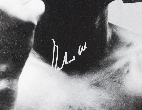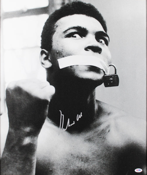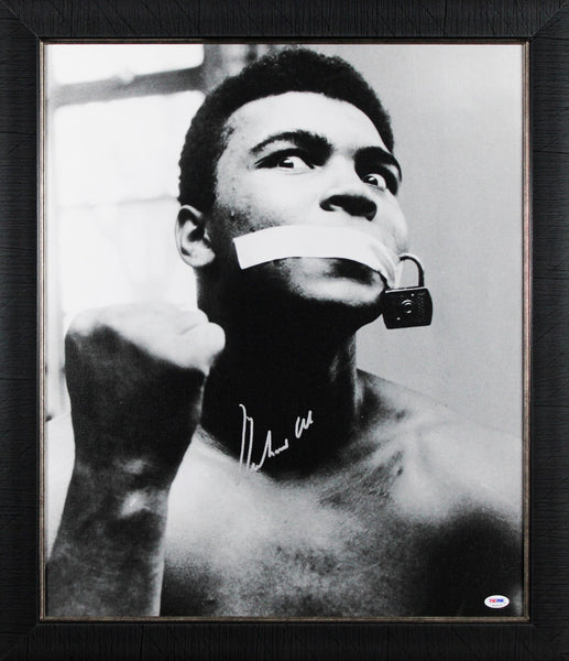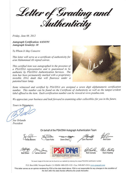 This Autographed Auto Graded Gem Mint 10! & Framed 20x24 Canvas has been Personally Signed by Muhammad Ali. This item is 100% Authentic and comes with a PSA/DNA Certification Card and a matching numbered Hologram. The authenticity can be verified on Professional Sports Authenticator website. This item has been professionally framed to overall dimensions of approximately 23.5 x 27.5 inches.