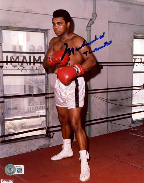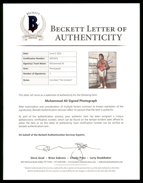 This is a Framed 8x10 Photo that has been hand signed by Muhammad Ali. This item was inscribed "The Greatest." This item has been certified authentic by Beckett Authentication (BAS) and comes with their tamper-proof sticker and matching full-page certificate of authenticity.