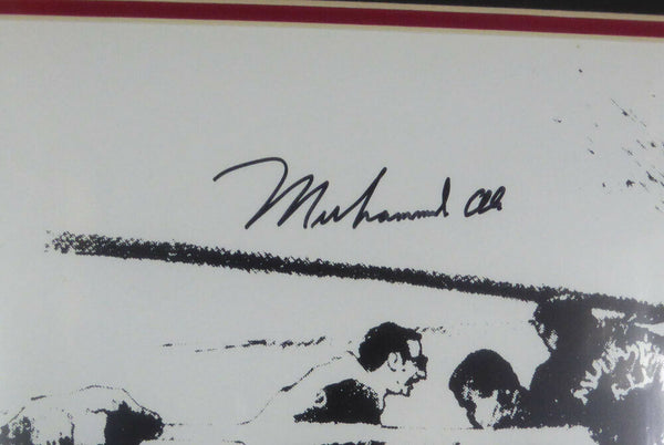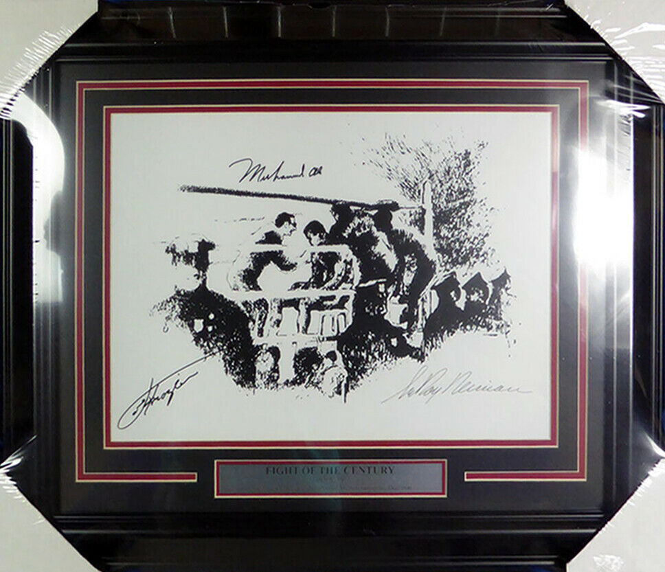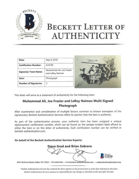 This is a Framed Lithograph Photo, approximately 20x24 with the frame, that has been hand signed by Muhammad Ali, Joe Frazier & LeRoy Neiman. It has been authenticated by Beckett (BAS) and comes with their sticker and matching full page certificate of authenticity.