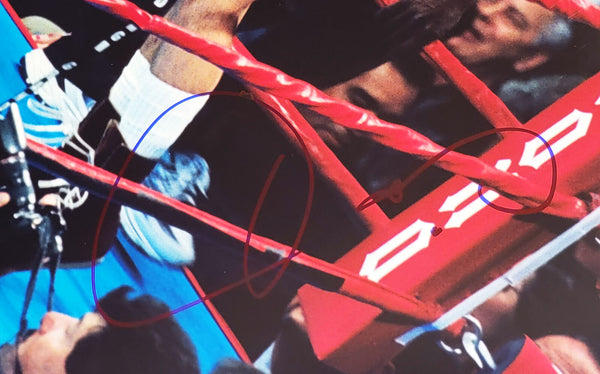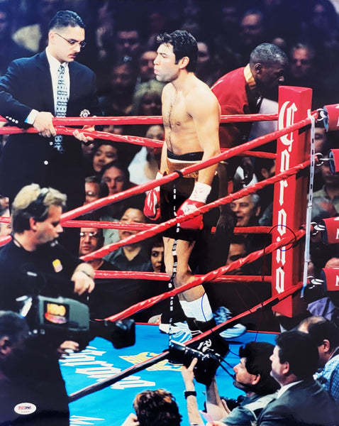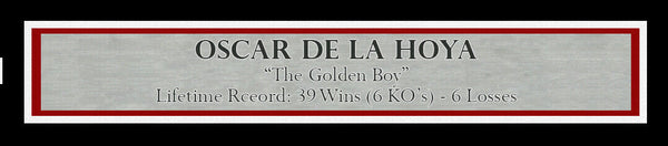 This is a Framed 16x20 Photo, approximately 24x28 with the frame, that has been hand signed by Oscar De La Hoya. Please note, there is a misspelling for the word "record" on the nameplate. This item has been certified authentic by PSA/DNA and comes with their tamper-proof sticker and matching certificate of authenticity.