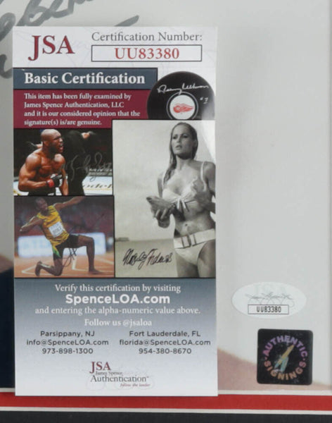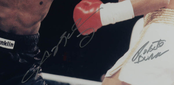 Custom frame measures 18" x 22" in size and features a photo signed by Sugar Ray Leonard (HOF) and Roberto Duran (HOF)The lot / autograph(s) includes an official James Spence Authentication (JSA) hologram and matching COA as well as an official Authentic Signings hologram for authenticity purposes.Please be aware there is some minor damage to the frame as pictured.Authentication: JSA COA & Authentic Signings Hologram