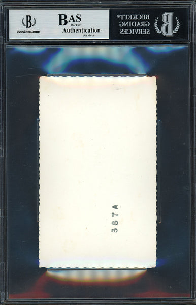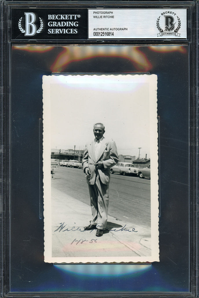 This is a 3.5x5.5 Photo that has been hand signed by Willie Ritchie. This is a vintage signature from 1953, dated by Ritchie. It has been certified authentic by Beckett Authentication (BAS) and comes encapsulated in their tamper-proof holder.