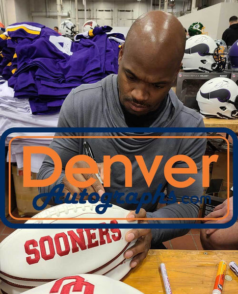 Adrian Peterson Signed Oklahoma Sooners Logo Football All Day Beckett 37720 The number in the listing title is just an inventory sku for our records and is not the authentication number. The item pictured is a stock photo unless otherwise noted. This is a Oklahoma Sooners white logo football that was personally autographed by Adrian Peterson with All Day inscription. Includes a certificate of authenticity from Beckett Authentication Services (BAS) and Denver Autographs.