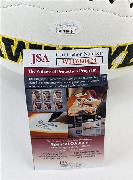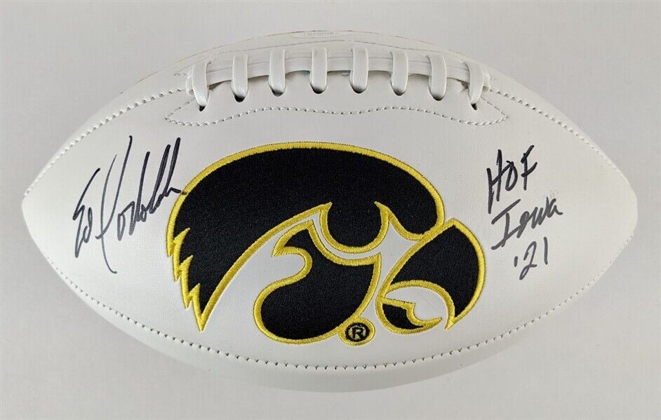 This autographed football has been personally hand-signed by Ed Podolak of the Iowa Hawkeyes. He added the inscription "HOF Iowa 21" along with his signature.This autograph is certified by James Spence Authentication's (JSA) Witnessed Protection Program. That means that a JSA representative was present when this item was signed. It comes with the numbered hologram and matching Certificate of Authenticity.