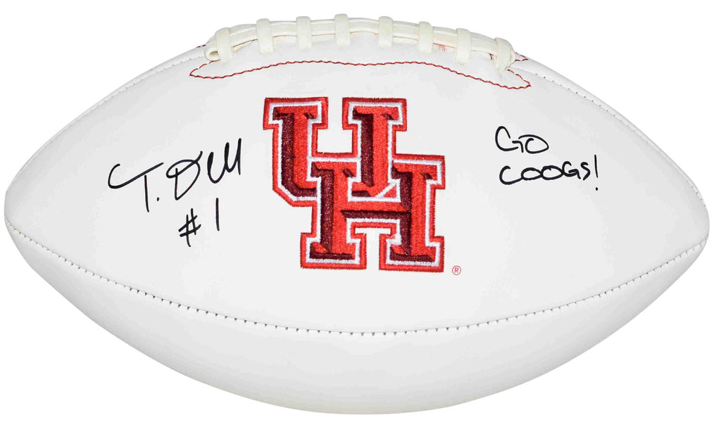 Tank Dell, former star wide receiver for the Cougars, has hand signed this Houston white panel logo football at a private signing. He included the inscription "Go Coogs!" with his signature. This item is authenticated by Beckett Authentication Services and was signed in the presence of one of their representatives. Their tamper-evident hologram featuring a QR code and serial number is on the item. The authenticity can be verified online by entering the serial number or scanning the QR code.Item pictured may not be the exact item you will receive. It will be similar quality, and we guarantee your satisfaction.