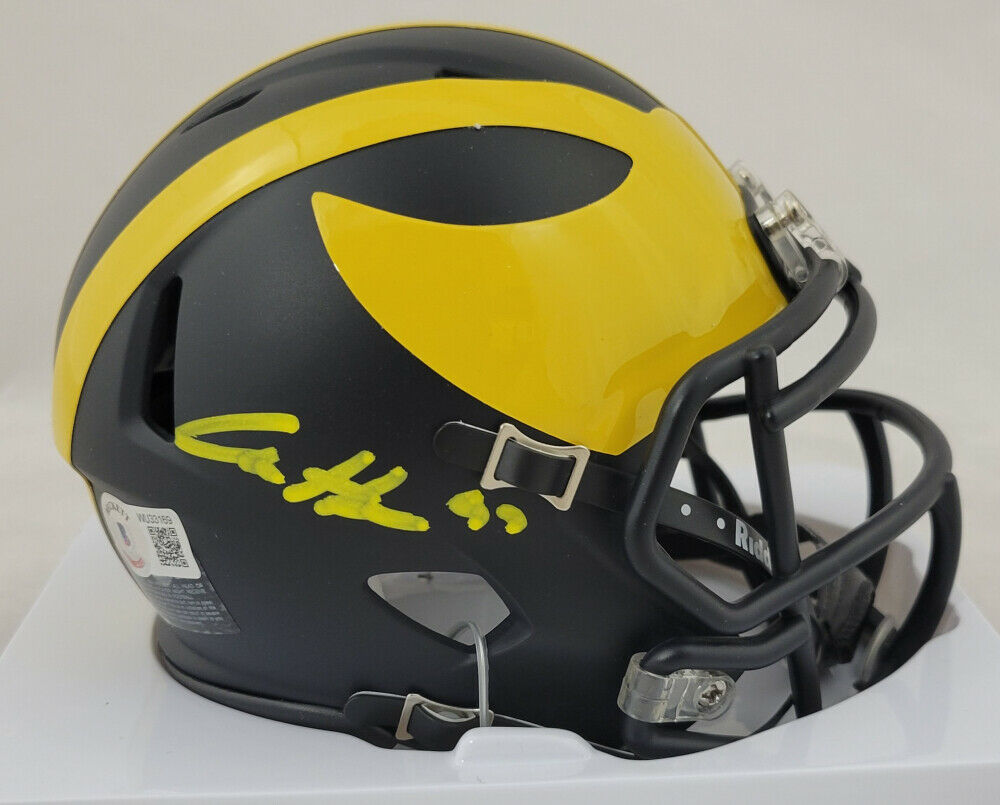 Riddell Michigan Wolverines Speed mini helmet. Hand-signed by Aidan Hutchinson.The lot / autograph(s) includes an official Beckett Authentication Services serially-numbered hologram for authenticity purposes. The signing of this item was witnessed by Beckett.Authentication: Beckett Hologram Shop our ebay store / Friendly Confines Collectibles for thousands of different autographed jerseys
