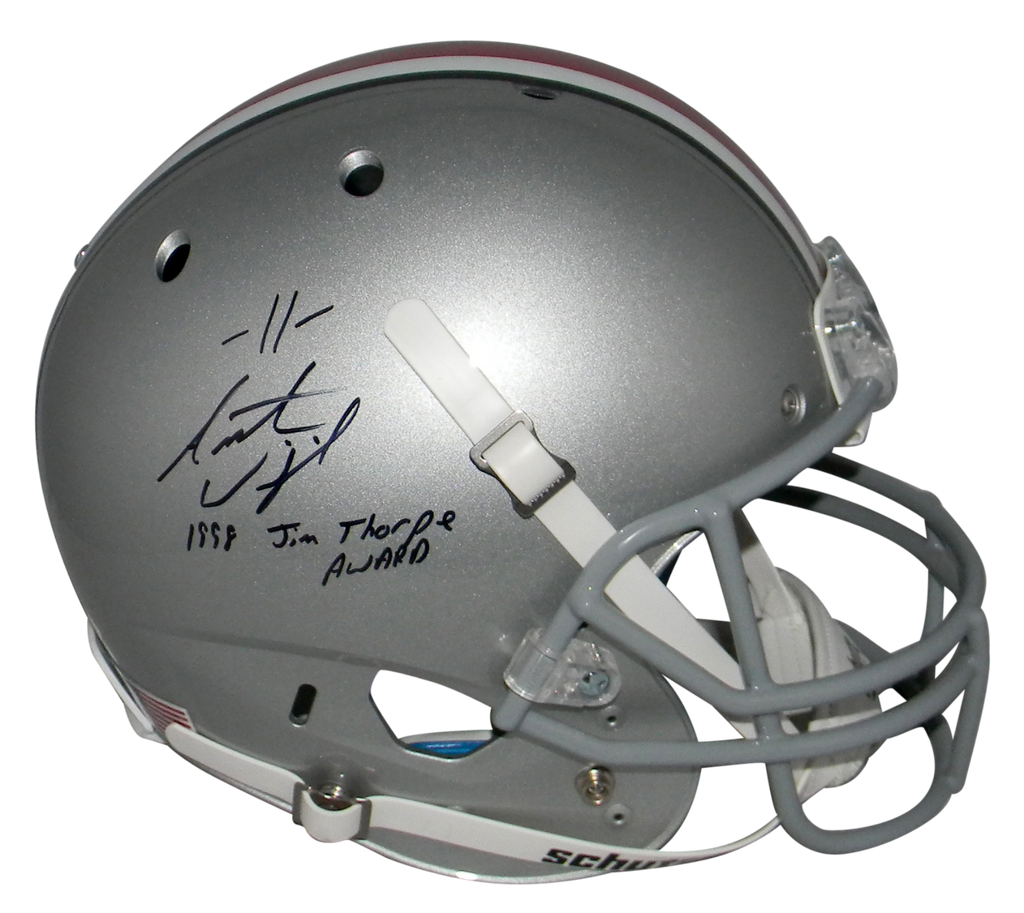 Antoine Winfield, former All-American safety for the Buckeyes, has hand signed this Ohio State Schutt full-size replica helmet at a private signing. He included the inscription "1998 Jim Thorpe Award". This item comes with a certificate of authenticity (COA) from JSA - James Spence Authentication and was signed in the presence of one of their representatives. You will receive a serial-numbered COA along with a matching serial-numbered sticker on the helmet. The authenticity can be verified online by entering the serial number.Item pictured may not be the exact item you will receive. It will be similar quality, and we guarantee your satisfaction.