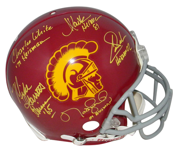 This USC Trojans Riddell full-size authentic helmet has been hand signed by 5 USC Heisman Trophy winners: Carson Palmer, Matt Leinart, Marcus Allen, Mike Garrett and Charles White. This item comes with a certificate of authenticity (COA) from Beckett Authentication Services and was signed in the presence of one of their representatives. You will receive a serial-numbered COA along with a matching serial-numbered sticker on the helmet. A Tristar Authentic serial-numbered hologram is also on the helmet.Item pictured may not be the exact item you will receive. It will be similar quality, and we guarantee your satisfaction.