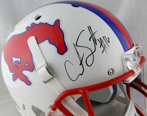Courtland Sutton Autographed SMU White F/S Schutt Helmet - Beckett Auth *Black This is a Hand Autograph of Courtland Sutton of the Southern Methodist University Mustangs on a Schutt Football Replica Full Size Helmet. This item has a Beckett Witness Authentication, which comes with a Beckett numbered sticker and a matching Certificate of Authenticity. You can view this item on the Beckett Authentication website, it shows when and where the item was signed. It was signed either at a public autograph appearance or a private signing. This is a stock photo of the item. Although you may not receive this exact item, the item you receive is virtually identical and brand new in great shape.