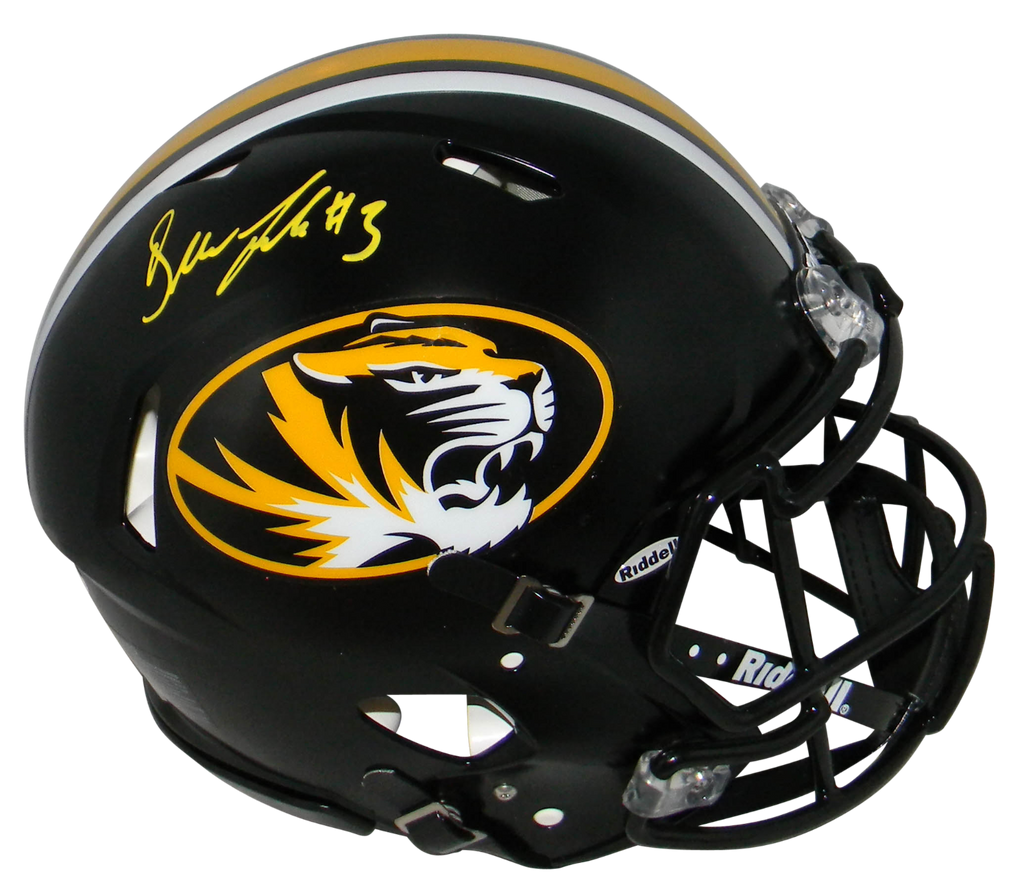 Drew Lock, former star quarterback for the Missouri Tigers, has hand signed this Missouri Riddell Speed full-size authentic helmet at a private signing. This helmet is fully padded inside like the ones worn on the field. This item comes with a certificate of authenticity (COA) from Beckett Authentication Services and was signed in the presence of one of their representatives. You will receive a serial-numbered COA along with a matching serial-numbered sticker on the helmet. The authenticity can be verified online by entering the serial number.Item pictured may not be the exact item you will receive. It will be similar quality, and we guarantee your satisfaction.