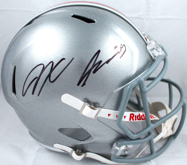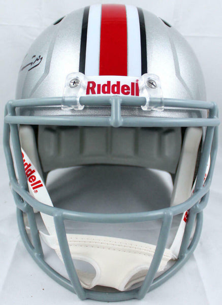 Jaxon Smith-Njigba Autographed Ohio State F/S Speed Helmet-Beckett Hologram *Black This is a hand autographed Helmet of Jaxon Smith-Njigba of the Ohio State University Buckeyes. This is a Riddell Football Full Size Speed Replica Helmet. This item has a Beckett Authentication, which comes with a Beckett numbered hologram and a QR code for verification. You can view this item on the Beckett Authentication website. It was signed either at a public autograph appearance or a private signing. This is a stock photo of the item. Although you may not receive this exact item, the item you receive is virtually identical and brand new in great shape.