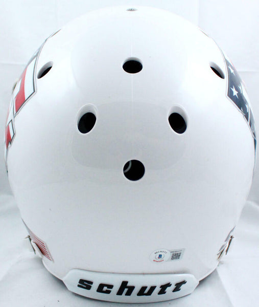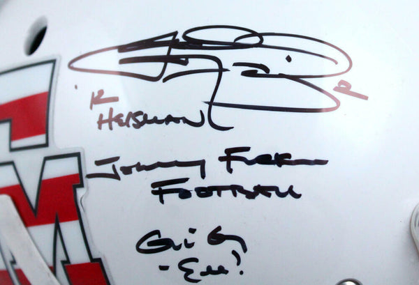 Johnny Manziel Autographed Texas A&M Schutt F/S Stars & Stripes Authentic Helmet w/3 Insc.-Beckett W Hologram *Black This is a Hand Autographed Helmet of Johnny Manziel of The Texas A&M Aggies. This is a Schutt Football Full Size Stars and Stripes Authentic Helmet. This item is inscribed with 12 Heisman, Johnny F'ing Football, Gig em'. This item has a Beckett Witnessed Authentication, which comes with a numbered sticker hologram and a QR code for verification. You can view this item on the Beckett website, it shows when and where the item was signed. It was signed either at a public autograph appearance or a private signing. This is a stock photo of the item. Although you may not receive this exact item, the item you receive is virtually identical and brand new in great shape.