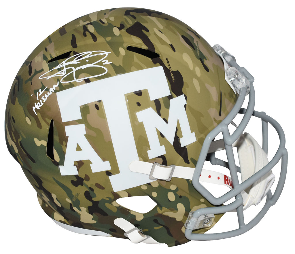 Johnny Manziel, former Heisman Trophy winning quarterback for the Aggies, has hand signed this Texas A&M Riddell Speed Camo full-size replica helmet at a private signing. He included the inscription "12 Heisman". This item comes with a serial-numbered hologram from Fanatics Authentic, one of the leaders in the industry. The authenticity can be verified online by entering the serial-number. A Fanatics Authentic information card is also included.Item pictured may not be the exact item you will receive. It will be similar quality, and we guarantee your satisfaction.
