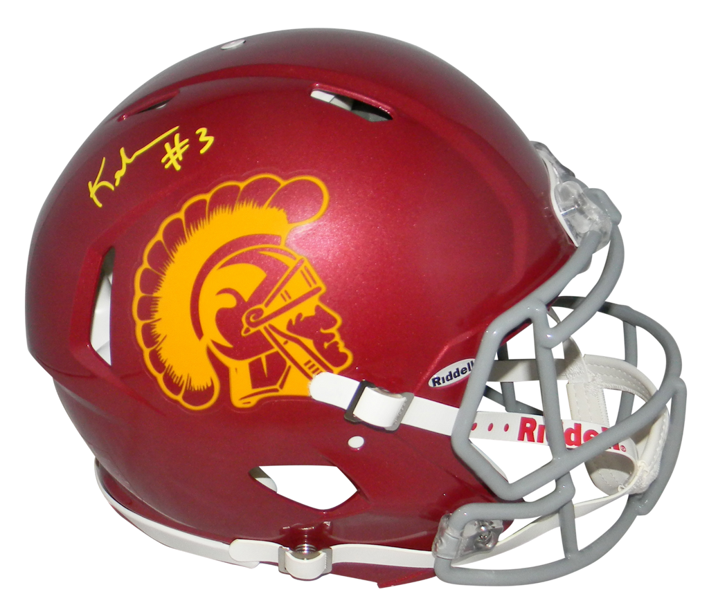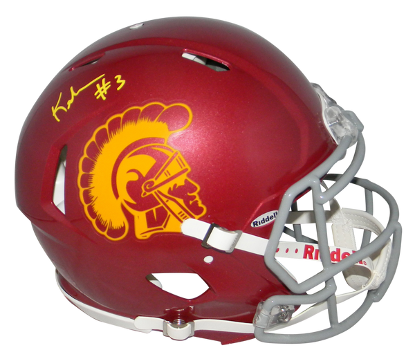 Keyshawn Johnson, former All-American wide receiver for the Trojans, has hand signed this USC Riddell Speed full-size authentic helmet at a private signing. This helmet is fully padded inside like the ones worn on the field. This item comes with a certificate of authenticity (COA) from JSA - James Spence Authentication and was signed in the presence of one of their representatives. You will receive a serial-numbered COA along with a matching serial-numbered sticker on the helmet. The authenticity can be verified online by entering the serial number.Item pictured may not be the exact item you will receive. It will be similar quality, and we guarantee your satisfaction.