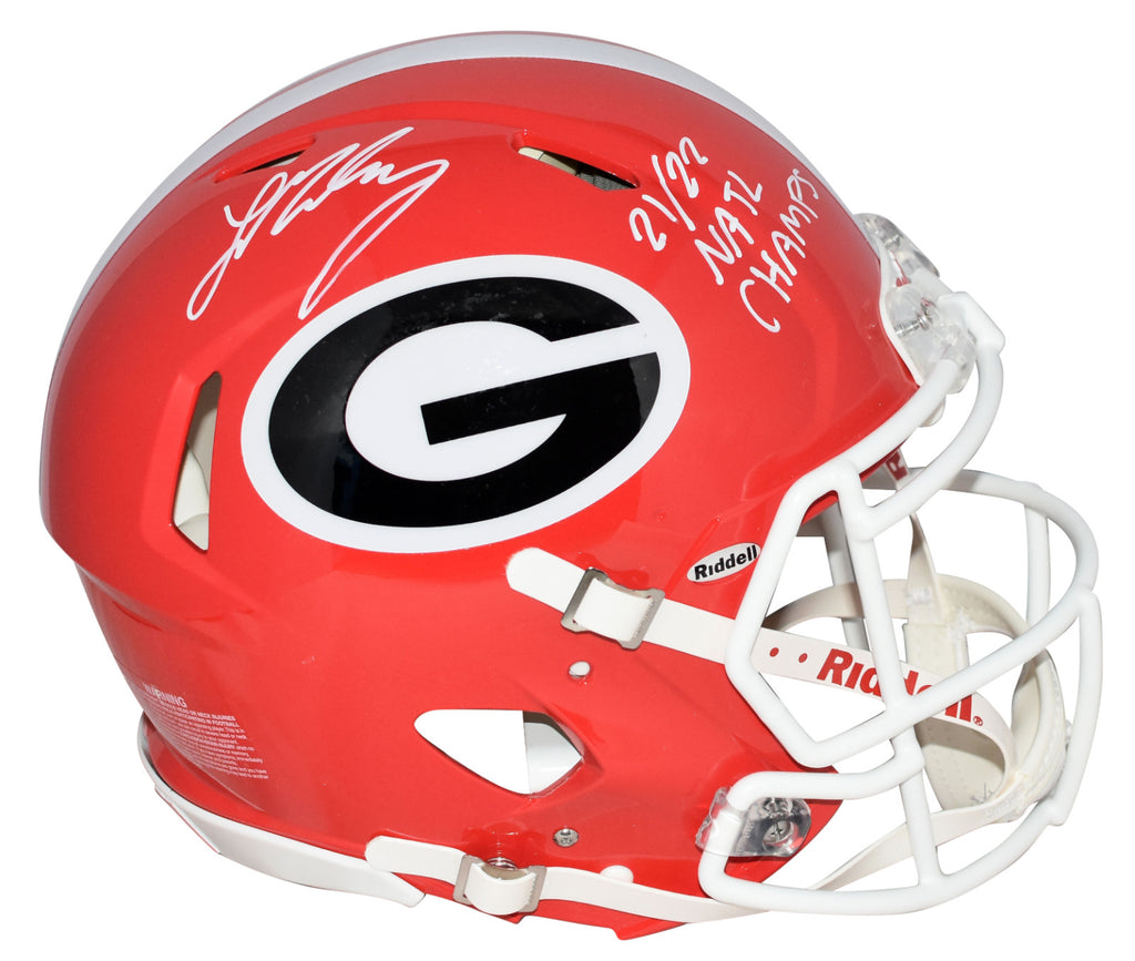 Ladd McConkey, former star wide receiver for the Bulldogs, has hand signed this Georgia Riddell Speed full-size authentic helmet at a private signing. He included the inscription "21/22 Natl Champs". This helmet is fully padded inside like the ones worn on the field. This item is authenticated by Beckett Authentication Services and was signed in the presence of one of their representatives. Their tamper-evident hologram featuring a QR code and serial number is on the item. The authenticity can be verified online by entering the serial number or scanning the QR code.Item pictured may not be the exact item you will receive. It will be similar quality, and we guarantee your satisfaction.