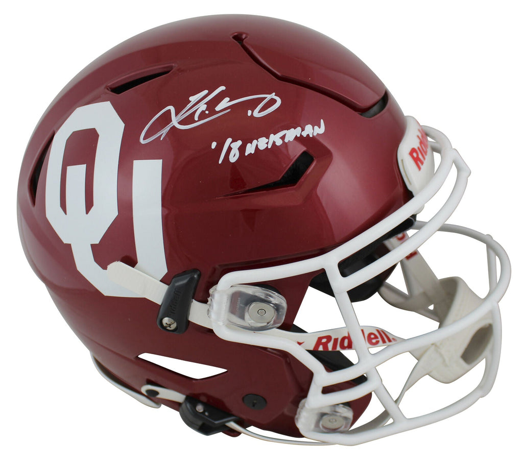 This Autographed Authentic Riddell Speed Flex Full Size Helmet with the inscription of "Heisman 2018" has been Personally Signed by Kyler Murray of the Oklahoma Sooners. This item is 100% Authentic to include a Certificate of Authenticity (COA) / hologram by Beckett Authentication Services. This is a BAS Witnessed Protection Program item which means a Beckett Authentication Service representative was present when this item was being signed. This is a stock item. We conducted an autograph signing with Kyler Murray and we have several of these available. The one you will receive will be of equal quality to the one pictured. This item can be verified through BAS Witnessed.